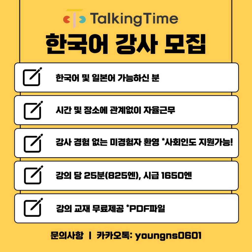 学研グループ의 외국어 레슨 서비스인 Talking Time에서 한국어 강사를 모집합니다!