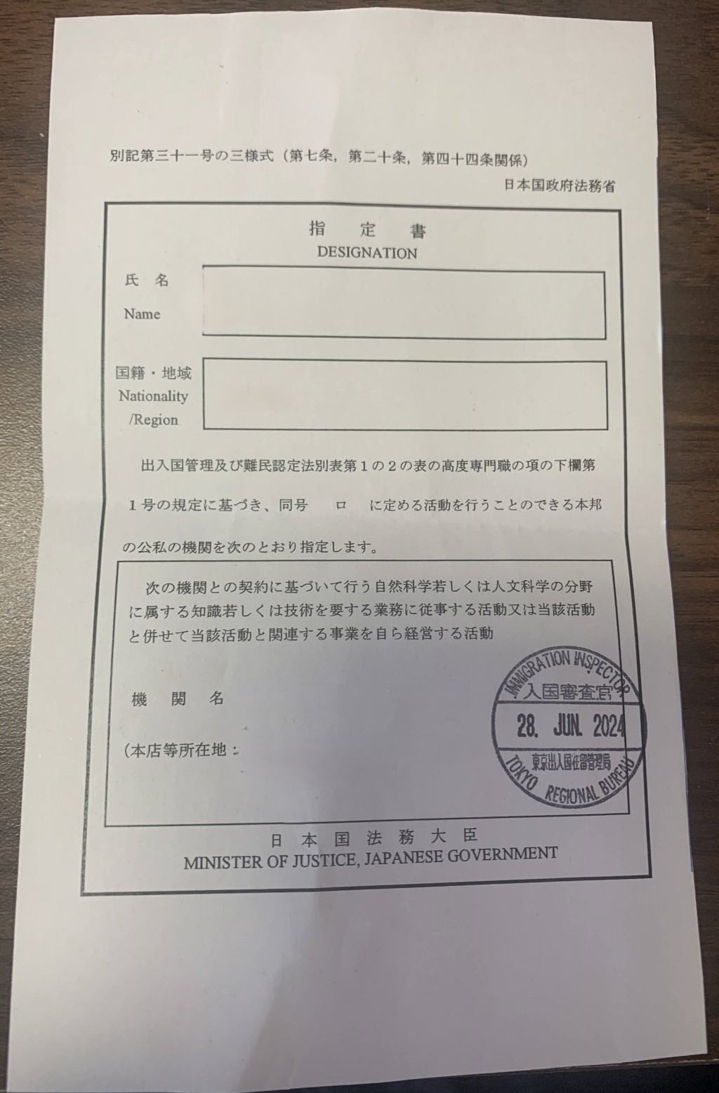 한편, 기술・인문지식・국제업무나 일본인의 배우자 등의 재류자격에는 지정서가 부착되지 않습니다.
